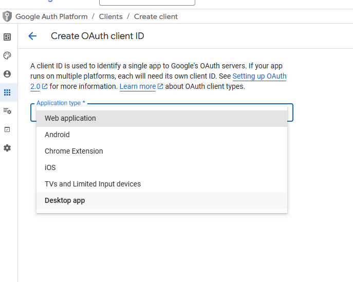 - Application type olarak Desktop app seçiyoruz (yerel geliştirme için en pratiği bu)