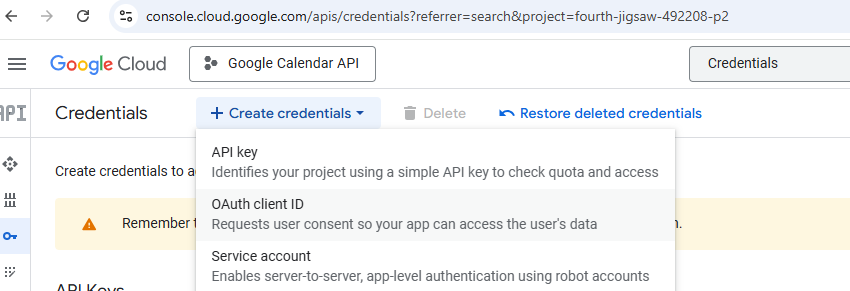 - Yeni bir proje oluşturup Google Calendar API‘yi arama çubuğundan bulup etkinleştiriyoruz