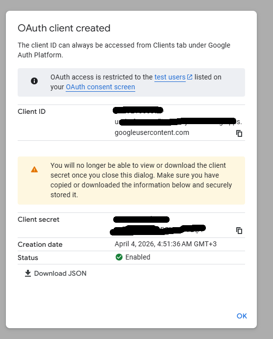 credentials.json oluşturma: